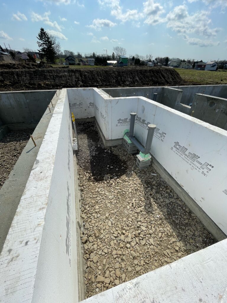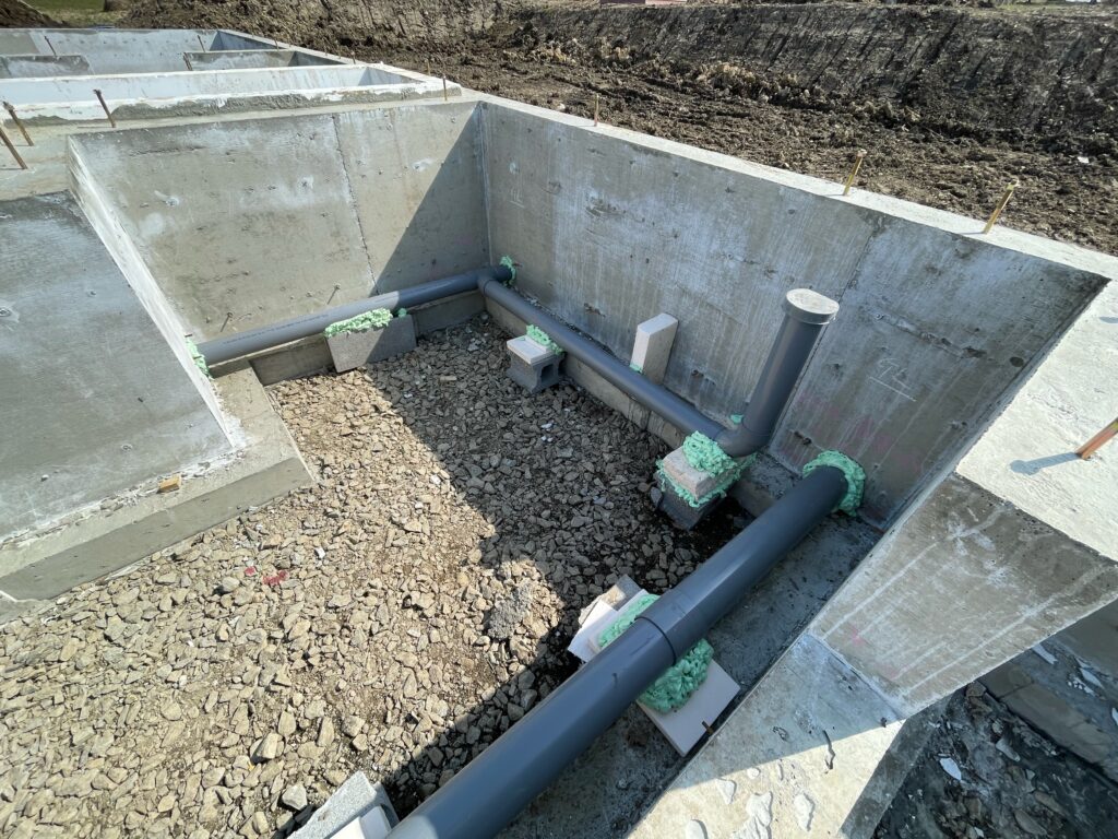 こんなふうに基礎の中に土を戻す前に排水配管を施設します。