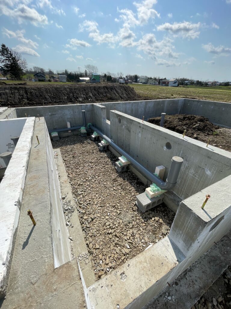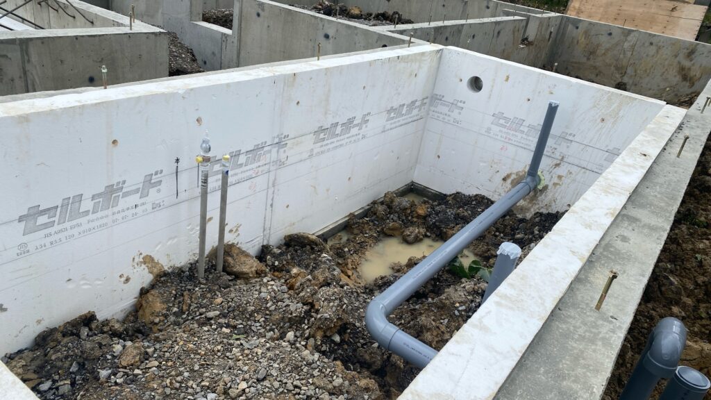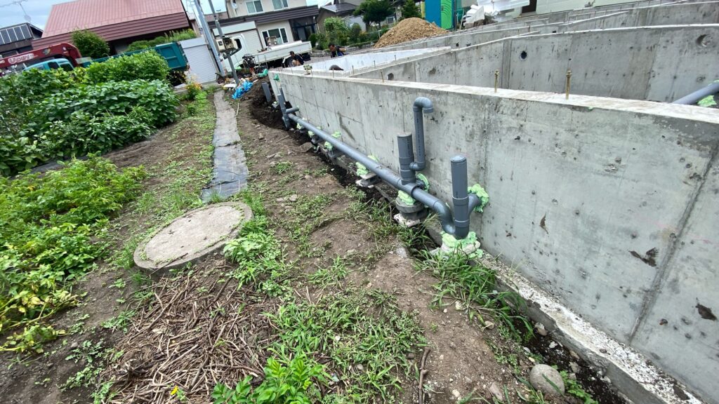 基礎の外側の放流先に向かっての配管はこんな感じです。