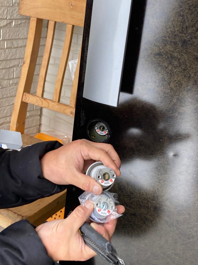 玄関ドアの鍵を1本なくした,防犯的に心配なのでシリンダーごと交換したいと依頼を受けました。メーカーと型番などを調べて合うシリンダーを探して交換しました。(まだ同じものがありました。)